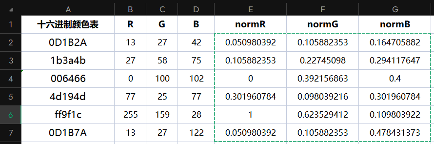 | Hex | R | G | B | R_norm | G_norm | B_norm |