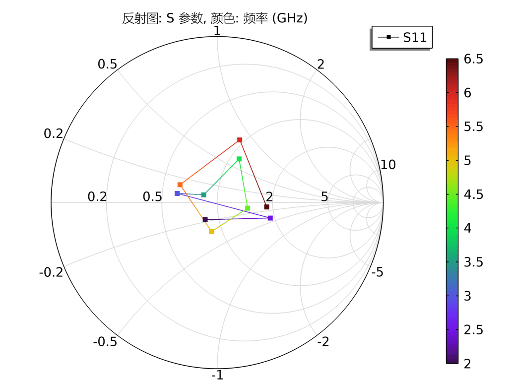 ——一张经典“花瓣”方向图立现。 - 史密斯图:同一维绘图组 → 史密斯图 → 端口阻抗