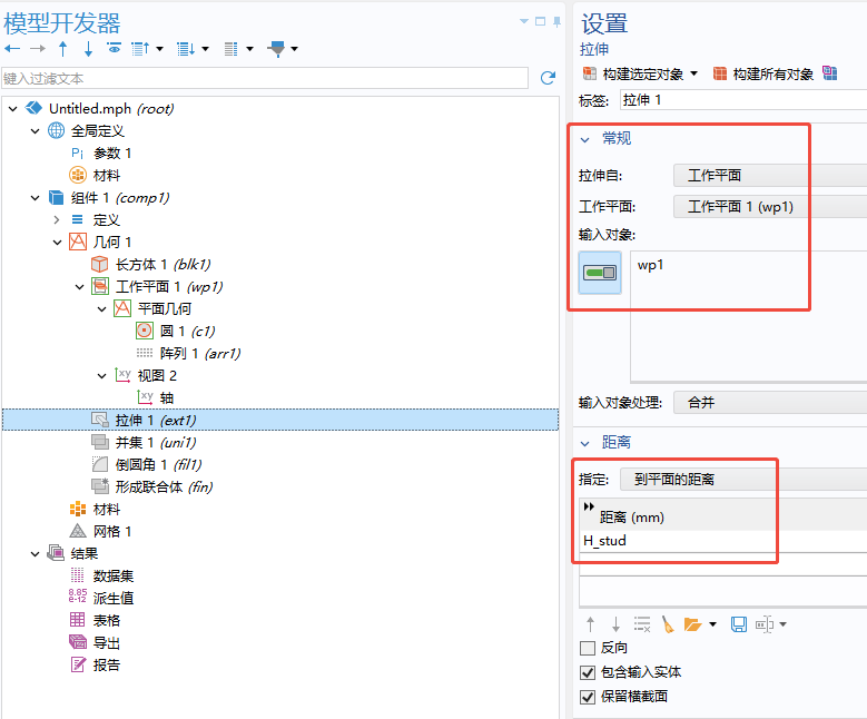 1.选中“草图 1” → 拉伸 → 距离 H_stud → 构建。