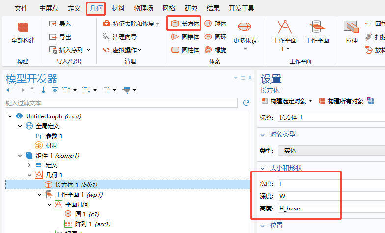 几何 1 → 右键 → 长方体 → 尺寸:长 L,宽 W,高 H_base → 构建。