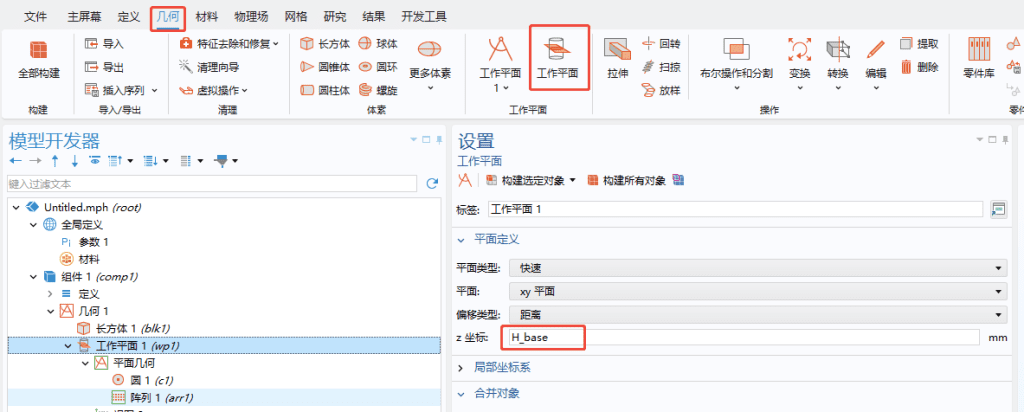1.几何 → 工作平面 → 默认 xy 平面 → 建。