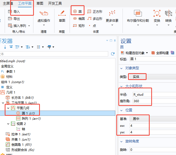 2.工作平面下 → 圆 → 圆心 (4[mm],4[mm]),半径 R_stud